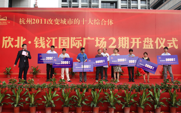 上午9点,杭州钱江科技城顺风路上车辆川流不息,前来参与开盘的业主、嘉宾陆续来到钱江国际广场现场。9点30分,两支舞狮队在锣鼓伴奏下热闹开演,拉开了仪式的序幕。钱江经济开发区党工委委员、管委会副主任金海平作了重要讲话,开发区管委会副主任赵世伟、党政办公室主任周江龙,集团公司董事长、总裁陈烟土,欣北公司总经理余樟松等出席开盘仪式。随着出席嘉宾完成剪彩仪式,钱江国际广场二期正式开盘,到场的业主、嘉宾、房产公司等无不欣悦。为答谢广大业主朋友对项目的厚爱,仪式中还设置了激动人心的抽奖互动环节,在现场的热烈气氛中再次掀起高潮。现场分别抽取了8名3000元现金抵价券、4名5000元现金抵价券、2名10000元现金抵价券等幸运大奖。