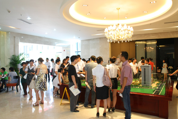 由于本期开盘的产品为欣北钱江国际广场升级力作,全新Up class理念公馆,由4号楼、5号楼及6号楼21-29层组成,现场销售异常火爆。鉴于现场前来的业主客户较多,开盘选房采取了按号牌顺序到销售大厅选房认购,其余客户们均在3号楼休息区休息。临近中午,销售大厅尤其火热,销售人员为看房者耐心的讲解楼盘项目。