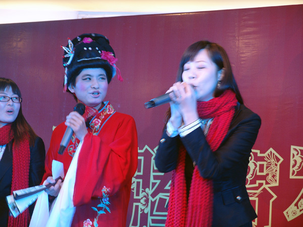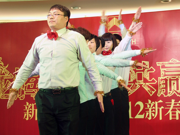 一曲由七位集团公司领导携手高歌的《敢问路在何方》拉开了本次新春年会的序幕,随后歌舞、独唱、小品、魔术、吉他弹唱等各种由员工精心准备的节目,你方唱罢我登场,让观众享受了一场视听盛宴。同时,一年一度的优秀员工颁奖以及幸运抽奖、属龙员工小游戏等穿插其中。集团公司总裁陈烟土为2011年的三位优秀员工——工程管理中心竺天放、成本管理部葛军贤、审计部吴珂蓝和一位表扬员工——营销管理中心胡勤民颁奖。这四位优秀员工还和集团公司领导一起抽取了101位幸运奖的获得者,将联欢会一次次推向高潮。
