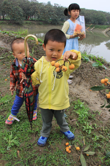 当天上午9点,参加活动的 14个家庭共 42人兴高采烈地来到了位于塘栖泉漳村的枇杷庄园。各位大朋友、小朋友们,一下车便被压弯枝头的累累果实所吸引。大人小孩们分工合作,不一会儿便把树枝低处的枇杷全部收罗入筐;还有的边吃边摘,将鲜美的果肉胡塞满嘴。过不来多久,大家便向果树的高处“进发”。有的亮出了从家自带的“秘密武器”,竹竿、雨伞齐上阵;有的玩起了“叠罗汉”,坐在父亲肩头的孩子将枇杷塞满了衣服口袋;甚至有的干脆攀爬上树,和枇杷来个“亲密接触”的同时让树下的人也纷纷坐享了实惠……大家边走边摘,边摘边吃,欢声笑语洒满了整个庄园。