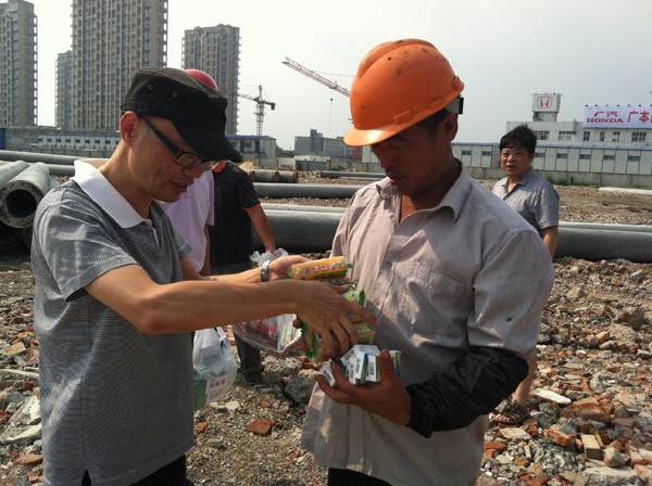 7月30日下午,杭州康信置业有限公司总经理蒋可扬带领公司管理层员工,顶着烈日来到康信项目施工现场。对在炎热天气仍坚守岗位的一线建筑工人表示慰问,并亲手送上慰问品。虽然这些慰问品价值不高,但每位在场的工人都真切感受到了公司领导对他们的关心。之后,康信公司领导还与这些高温下的劳动者们热情攀谈,了解施工现场情况和他们的生活状况,并感谢他们冒高温奋战在施工岗位,确保工程项目的顺利进行。