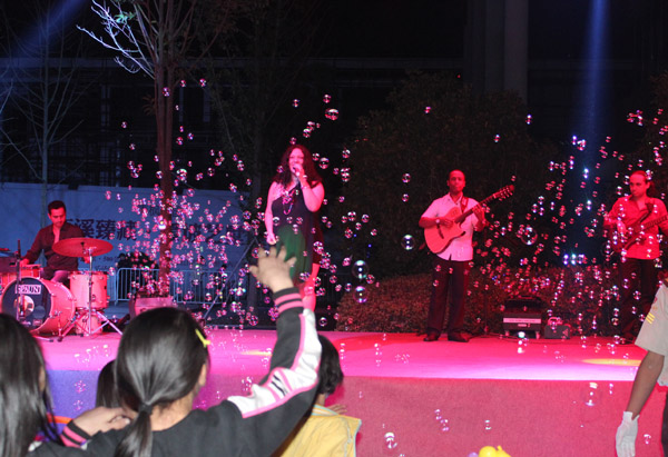 第二个上台的是来自德国的“Hi3乐队”,他们演唱了蓝调风格的《Summer Time》、《Let It Be》、《Come Together》等歌曲,并以中文歌曲《甜蜜蜜》压轴。老外唱中文老歌,全场顿时响起了一股掌声,有的还跟着唱了起来。随后上台的是来自列农故乡——英国的“风暴乐队”,他们演唱了《Fly Me To The Moon》、《Why You Cry》等四首老歌。最后一个环节是小朋友的互动游戏,主持人刚宣布完游戏规则,台下的小朋友们就举手踊跃报名,现场气氛格外热烈。