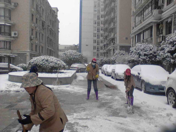 红石商务大厦服务中心负责人陈安凌为了保障大厦办公人员的出入安全,带领红石服务中心全体员工进行了扫雪,大家扫的扫,铲的铲,干得热火朝天。为了使盛德嘉苑小区业主早上的顺利出行,物业服务中心保洁人员决定当晚不回家,当新的一天黎明来临时,服务中心的保洁员、秩序维护员们已经在清除积雪了。新青年广场服务中心负责人黄勇标也迅速召集了办公室工作人员及秩序维护员组建“扫雪突击队”,进行了扫雪铲冰作业。由于新青年广场业主出行的主干道只有一条,因此必须先把主干道清理干净,以保证业主的顺利出行及安全。