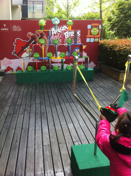 广场上小朋友们手中拿着造型各异的气球及彩色棉花糖,同时也勾起了大人们对于童年的回忆。想必大家都玩过电脑游戏“愤怒的小鸟”吧?现在真人版“愤怒的小鸟”也来到了青枫墅园,它们不再愤怒,而是带来无比的欢乐;投篮机让大家一试身手,五十多岁的业主廖大伯竟然打出了309分的高分,老当益壮的球技不禁让人惊叹;还有小朋友们喜欢的动画角色灰太狼,这次可不是来抓羊的哦,而是陪大家一起合影留恋的。