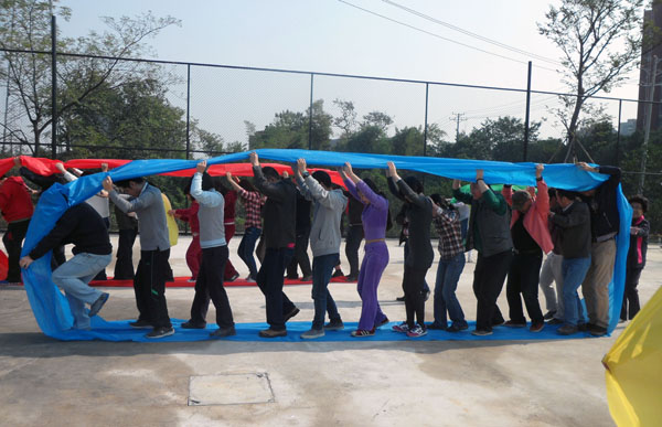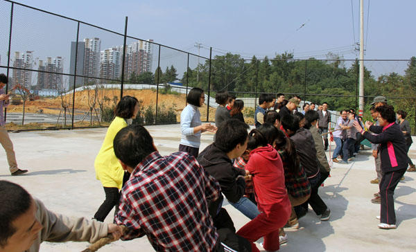 活动聘请了户外活动策划公司的专业教练来到现场负责全程指导和协调。将全体员工分成四个“山寨”,各山寨成员在“寨主”的带领下迅速投入到活动环节。活动安排了袋鼠运输队、无敌风火轮、疯狂传球赛、团队拔河赛等四个项目,活动内容既充满趣味性,又不失竞争的因素。各“山寨”成员为了团队的集体荣誉,激情投入到每个项目的紧张角逐之中,大家各出奇招,队友间密切配合,踊跃争先。现场的呐喊声、加油声不绝于耳,欢声笑语可见于每个人的面庞,大家的认真投入和热情参与营造了张力十足的活动氛围。