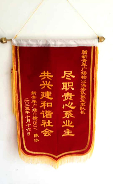 不久之后,服务中心收到了业主送来的 “尽职责心系业主,共兴建和谐社会”的锦旗,并对新青年广场服务中心及处理此次事件的秩序维护队长张发军进行了当面表扬。这面锦旗不仅代表着业主对服务中心工作的肯定,也进一步激发了服务中心的工作热情,在今后的工作中服务中心将一如既往,本着“想业主所想,急业主所急”的工作精神当好业主的好管家。