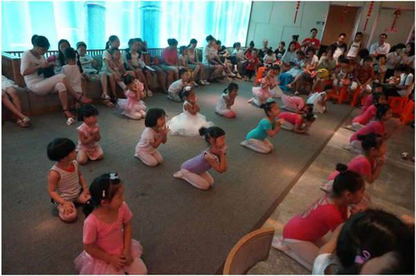 10:30随着音乐的响起,舞蹈老师带着4位学生以一曲美轮美奂的儿童中国舞蹈为舞蹈培训课拉开了序幕,而此时活动也达到了最高潮。有10余位小朋友鼓起了勇气进入舞蹈区跟随老师一起上课,学习儿童中国舞基础知识,而后加入的小朋友不断增多,课程也从原定的30分钟延长到了1个小时。