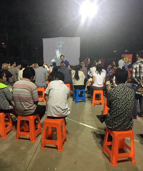 南北·乐章项目为感谢瓶窑人民对项目的认可,特地组织开展了秋季电影展播,为瓶窑人民送去欢乐,表达谢意。适逢反法西斯抗战胜利70周年,南北·乐章特意挑选了大型爱国军旅题材影片《战狼》做为展播电影,又临近中秋节,项目在展播现场还准备了美味的月饼共大家品尝。